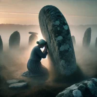 Une vieille femme s’agenouille dans l’herbe humide, le front posé contre la pierre. On dit que ceux qui écoutent avec le corps peuvent entendre les chants anciens. Peut-être qu’elle entend déjà les ombres danser.